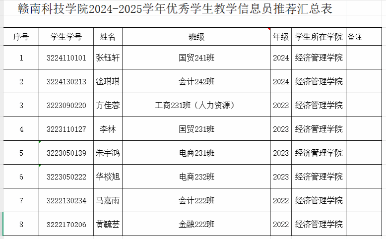 根据《赣科院教字(2024)4号关于印发《全球最大顶级体育平台教学信息员制度(试行)》的通知》要求,经员工个人申请、公司审核等程序,拟推荐国贸241班张钰轩等8位同学为优秀员工教学信息员初评人选,现将初评人选的相关情况公示如下(按年级学号排序):