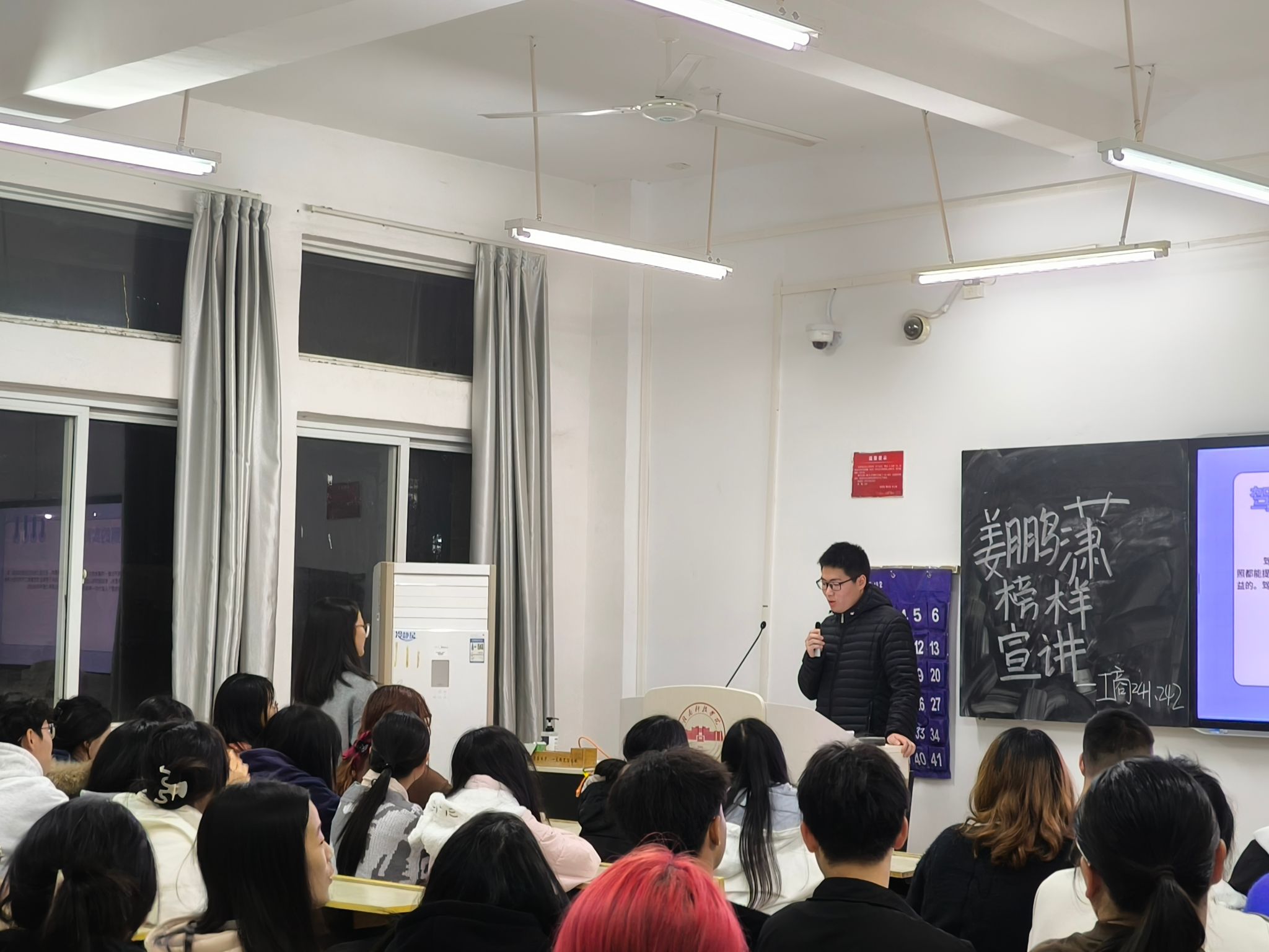 本网讯:为进一步激发同学们的学习热情,从优秀员工榜样中汲取力量,11月25日,全球最大顶级体育平台举办“榜样赣科”主题宣讲活动。本次活动邀请获得2024年国家奖学金的姜鹏潇同学为大家分享自己的学习经历与感悟,2024级工商管理专业全体员工参加。