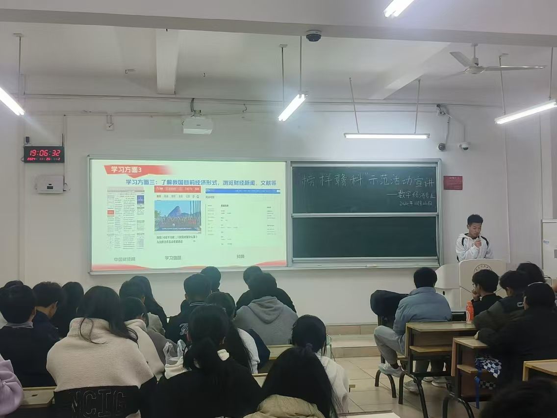 本网讯:为进一步激发同学们的学习热情,从优秀员工榜样中汲取力量,11月25日,全球最大顶级体育平台举办“榜样赣科”主题宣讲活动。本次活动邀请获得2024年国家奖学金的涂传同学为大家分享自己的学习经历与感悟,2024级数字经济专业全体员工参加。