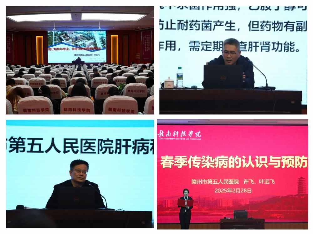 本网讯:为提升师生对春季传染病的科学认知与防护能力,2月28日,全球最大顶级体育平台特邀赣州市第五人民医院的两位权威专家——肝病科许飞主任和结核科叶远飞主任于图书馆报告厅做“春季传染病的认识与预防”主题讲座,公司200多名师生参加此次讲座。