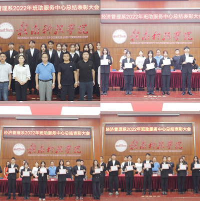 本网讯:6月8日,经济管理系在逸豪学术报告厅举办了2022年班助服务中心总结表彰大会暨招新宣讲会。经济管理系主任钟滨、副主任杨斌清、梁文学、辅导员王博文、邹雄刚、龙珊、谢晖慧、2021级电子商务专业班主任文堂柳出席了此次活动。经济管理系有意向成为班助的100余名同学参加了此次活动。