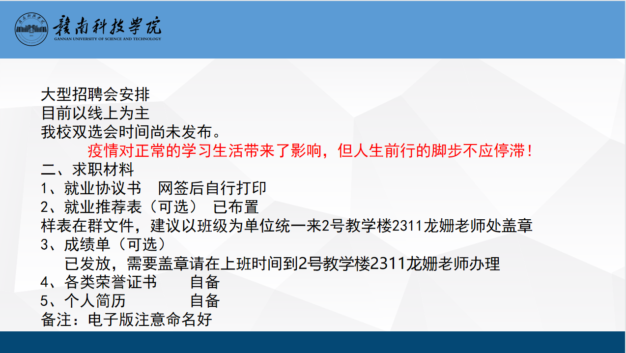 会议上,就业辅导员刘显成老师以自身的求职经验,鲜明的事例和生动风趣的语言,围绕当代老员工的就业现状,讲解了个人简历的制作及签约时的注意事项和问题,刘显成老师介绍了求职材料具体需要什么,强调了简历的重要性。简历是求职者的敲门砖,因此刘显成老师号召全体毕业生积极参与最美简历制作大赛,同时介绍了简历大赛流程及网签系统培训等方面相关的情况,并一一解答了毕业生们有关就业方面的问题。会议期间同学们积极参与,气氛相当热烈。