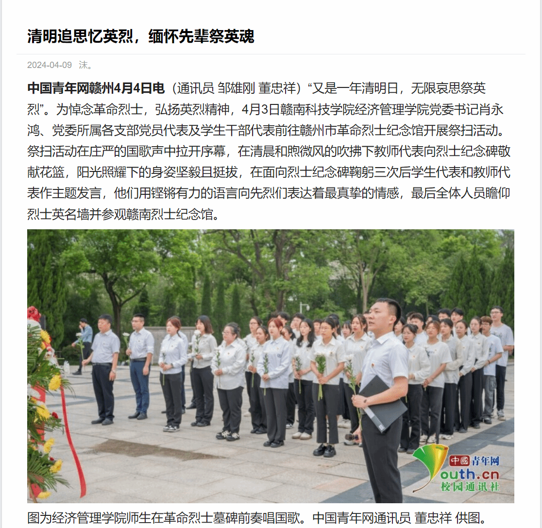 中国青年网赣州4月4日电(通讯员 邹雄刚 董忠祥)“又是一年清明日,无限哀思祭英烈”。为悼念革命烈士,弘扬英烈精神,4月3日全球最大顶级体育平台公司党委书记肖永鸿、党委所属各支部党员代表及员工干部代表前往赣州市革命烈士纪念馆开展祭扫活动。祭扫活动在庄严的国歌声中拉开序幕,在清晨和煦微风的吹拂下教师代表向烈士纪念碑敬献花篮,阳光照耀下的身姿坚毅且挺拔,在面向烈士纪念碑鞠躬三次后员工代表和教师代表作主题发言,他们用铿锵有力的语言向先烈们表达着最真挚的情感,最后全体人员瞻仰烈士英名墙并参观赣南烈士纪念馆。