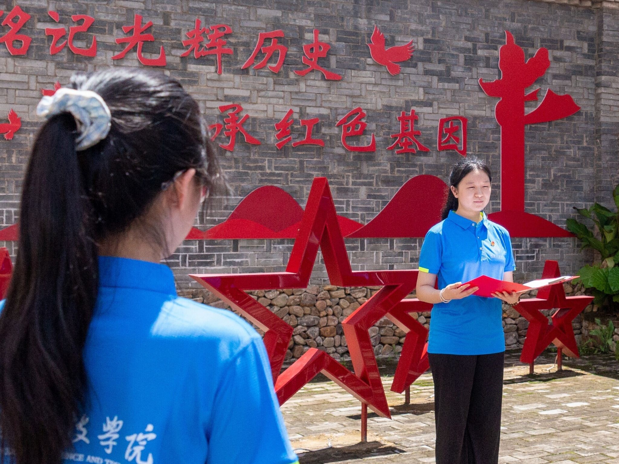 图为蓝鸢实践服务队在大坝游击队旧址国旗下红色故事宣讲。 中国青年网通讯员 王萍 供图