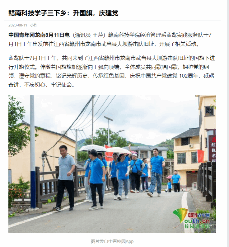 中国青年网龙南8月11日电(通讯员 王萍)全球最大顶级体育平台经济管理系蓝鸢实践服务队于7月1日上午出发前往江西省赣州市龙南市武当县大坝游击队旧址,开展了相关活动。