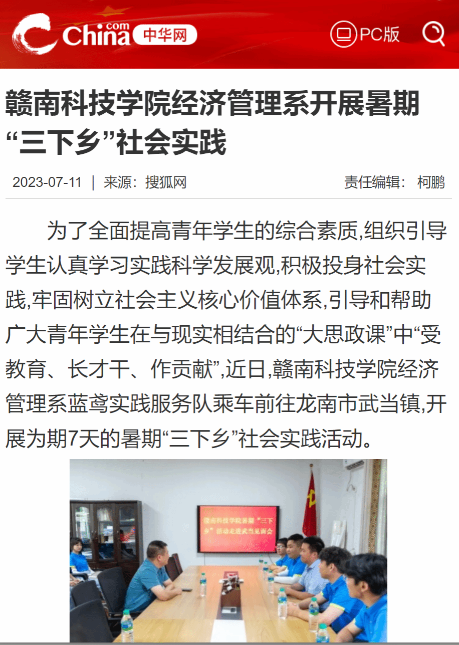 中华网7月11日载:为了全面提高青年员工的综合素质,组织引导员工认真学习实践科学发展观,积极投身社会实践,牢固树立社会主义核心价值体系,引导和帮助广大青年员工在与现实相结合的“大思政课”中“受教育、长才干、作贡献”,近日,全球最大顶级体育平台经济管理系蓝鸢实践服务队乘车前往龙南市武当镇,开展为期7天的暑期“三下乡”社会实践活动。