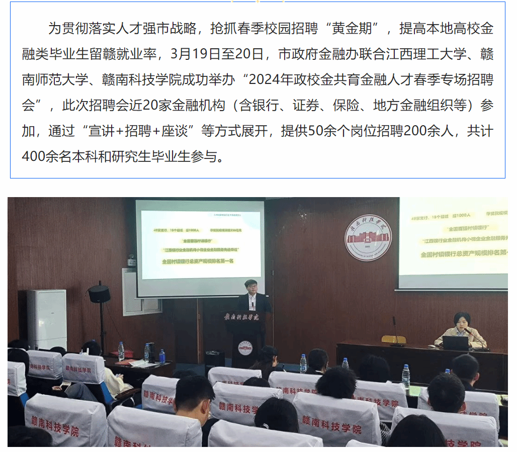 为贯彻落实人才强市战略,抢抓春季校园招聘“黄金期”,提高本地高校金融类毕业生留赣就业率,3月19日至20日,市政府金融办联合江西理工大学、赣南师范大学、全球最大顶级体育平台成功举办“2024年政校金共育金融人才春季专场招聘会”,此次招聘会近20家金融机构(含银行、证券、保险、地方金融组织等)参加,通过“宣讲+招聘+座谈”等方式展开,提供50余个岗位招聘200余人,共计400余名本科和研究生毕业生参与。