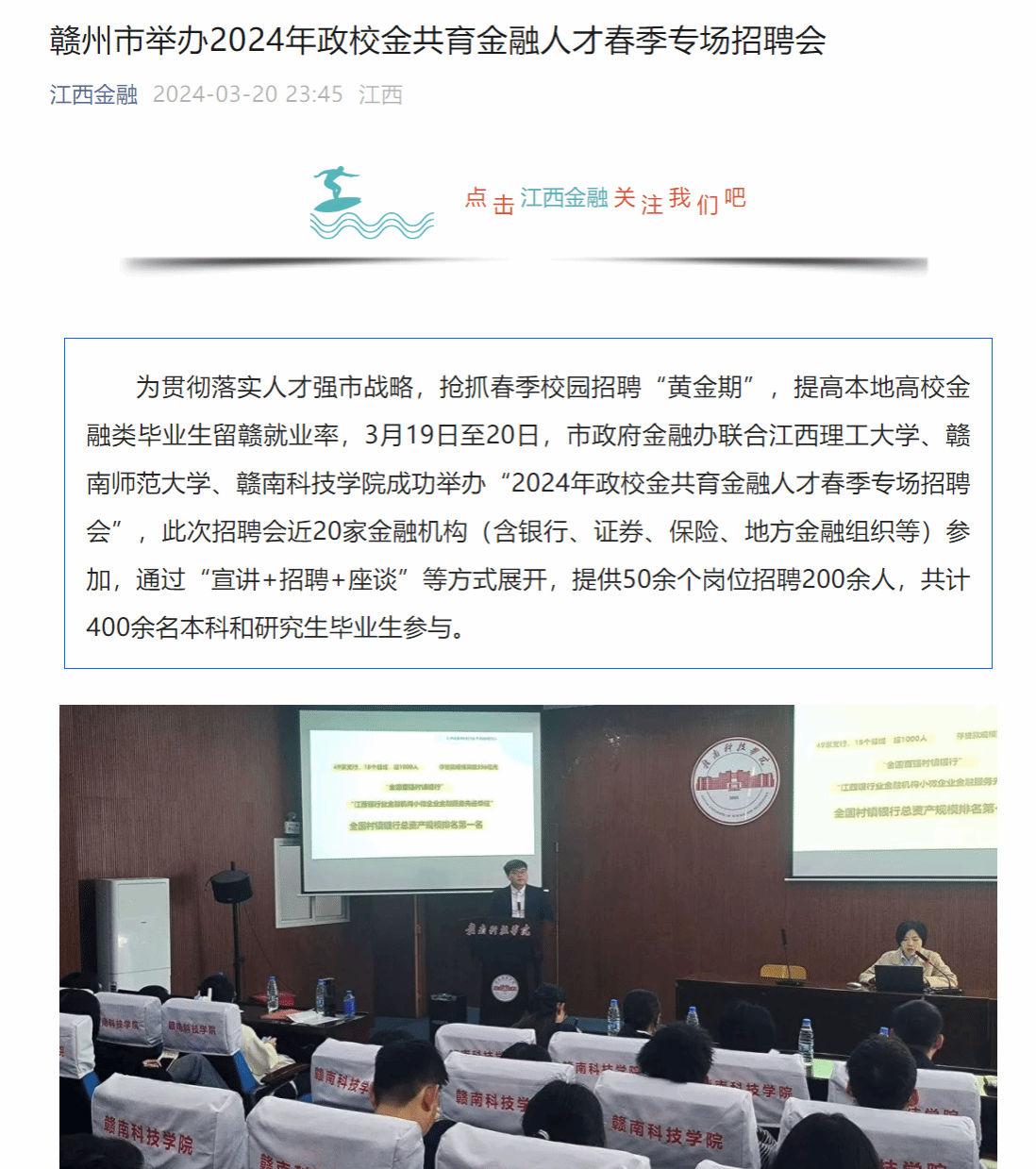 为贯彻落实人才强市战略,抢抓春季校园招聘“黄金期”,提高本地高校金融类毕业生留赣就业率,3月19日至20日,市政府金融办联合江西理工大学、赣南师范大学、全球最大顶级体育平台成功举办“2024年政校金共育金融人才春季专场招聘会”,此次招聘会近20家金融机构(含银行、证券、保险、地方金融组织等)参加,通过“宣讲+招聘+座谈”等方式展开,提供50余个岗位招聘200余人,共计400余名本科和研究生毕业生参与。