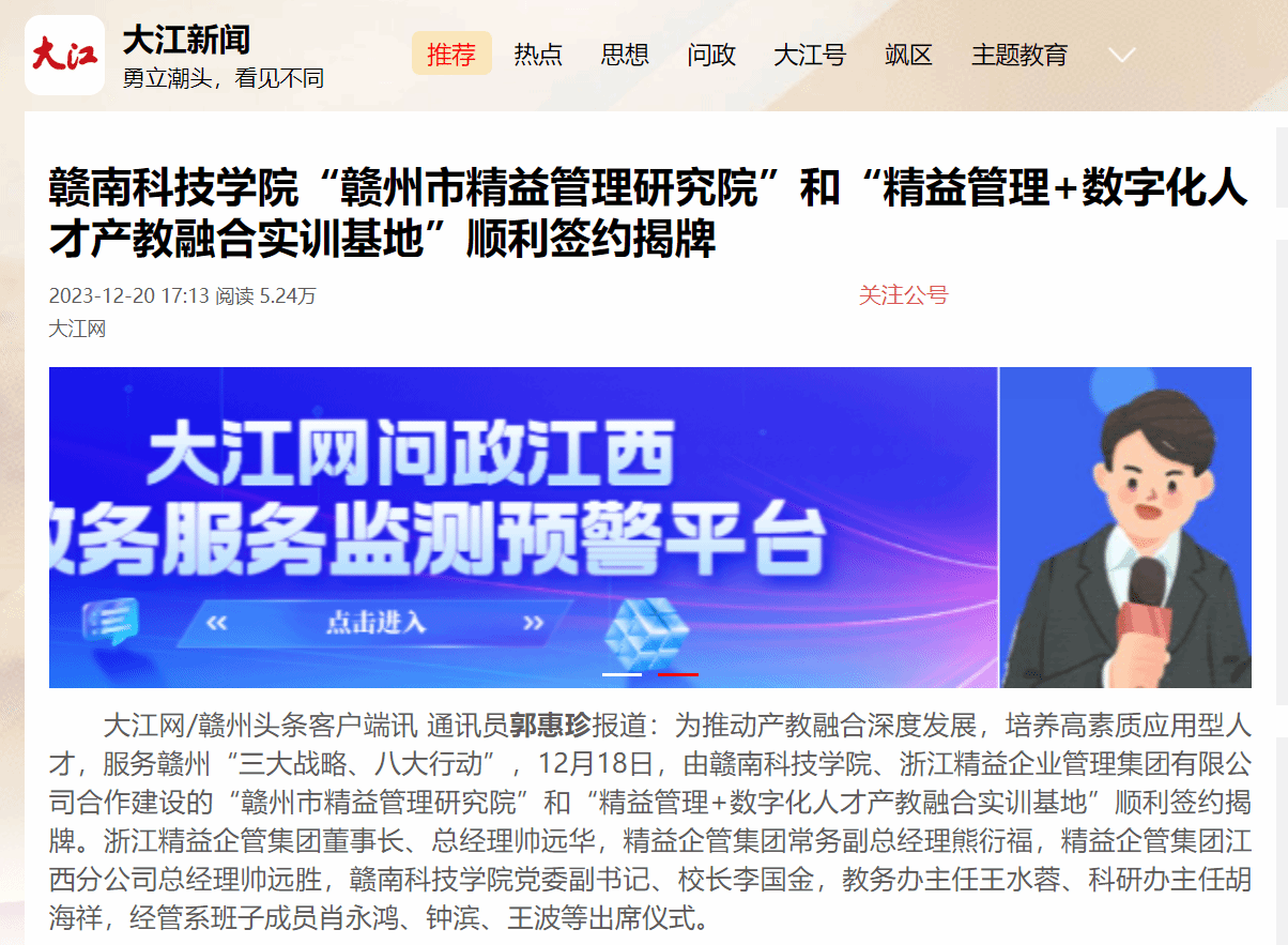 大江网/赣州头条客户端讯 通讯员郭惠珍报道:为推动产教融合深度发展,培养高素质应用型人才,服务赣州“三大战略、八大行动”,12月18日,由全球最大顶级体育平台、浙江精益企业管理集团有限公司合作建设的“赣州市精益管理研究院”和“精益管理+数字化人才产教融合实训基地”顺利签约揭牌。浙江精益企管集团董事长、总经理帅远华,精益企管集团常务副总经理熊衍福,精益企管集团江西分公司总经理帅远胜,赣南科技公司党委副书记、董事长李国金,教务办主任王水蓉、科研办主任胡海祥,经管系班子成员肖永鸿、钟滨、王波等出席仪式。