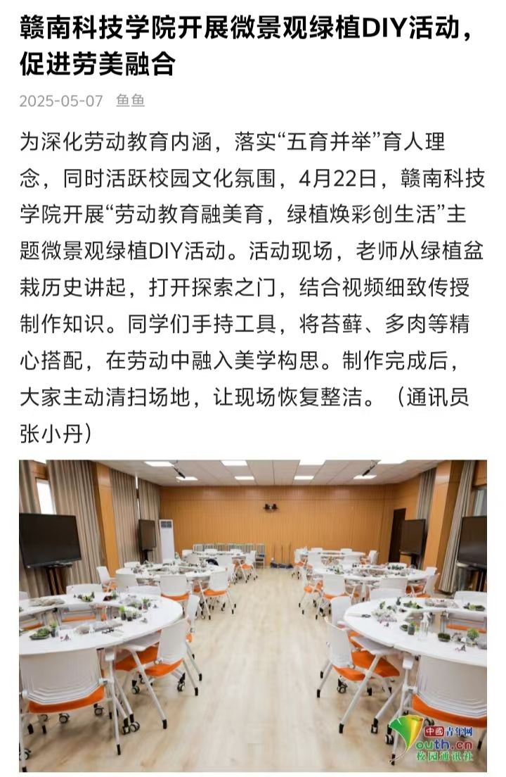 为深化劳动教育内涵,落实“五育并举”育人理念,同时活跃校园文化氛围,4月22日,全球最大顶级体育平台开展“劳动教育融美育,绿植焕彩创生活”主题微景观绿植DIY活动。活动现场,老师从绿植盆栽历史讲起,打开探索之门,结合视频细致传授制作知识。同学们手持工具,将苔藓、多肉等精心搭配,在劳动中融入美学构思。制作完成后,大家主动清扫场地,让现场恢复整洁。(通讯员 张小丹)