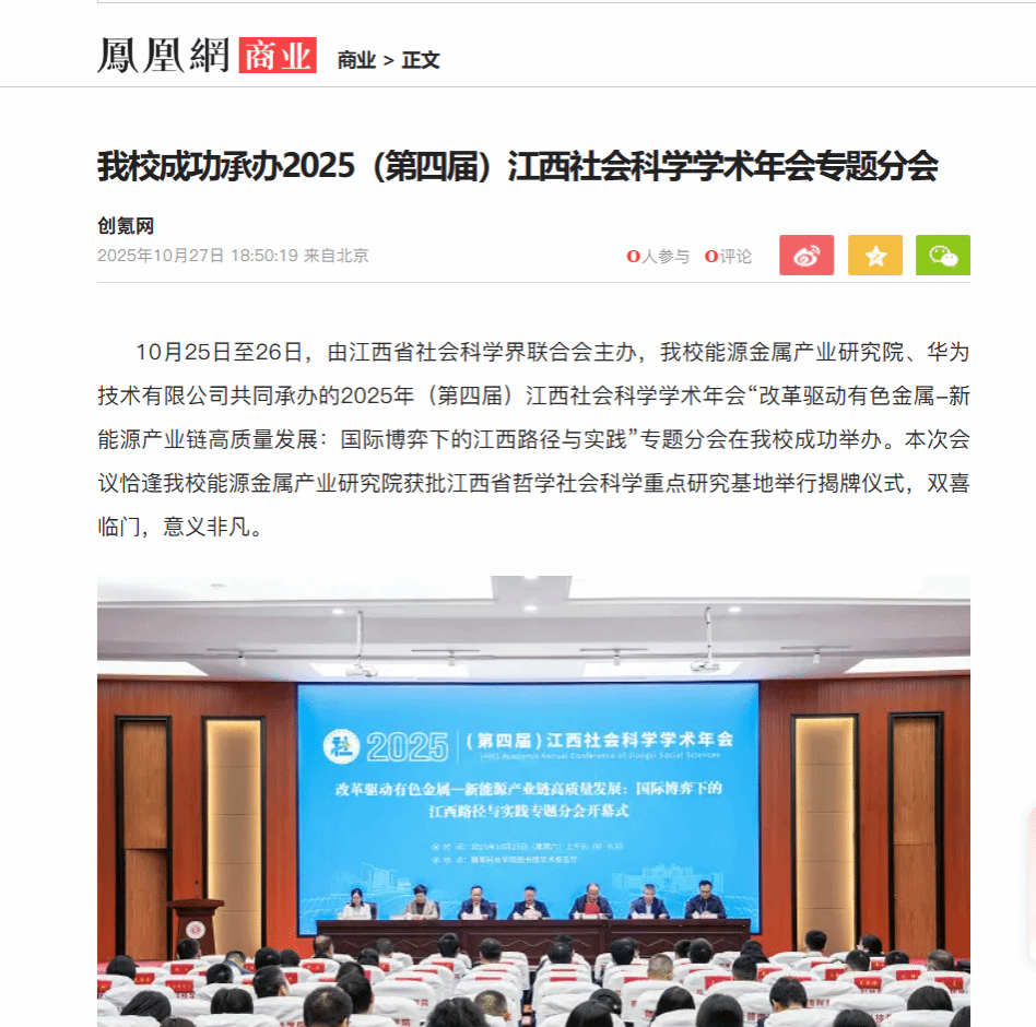 本网讯:10月25日至26日,由江西省社会科学界联合会主办,公司能源金属产业研究院、华为技术有限公司共同承办的2025年(第四届)江西社会科学学术年会“改革驱动有色金属-新能源产业链高质量发展:国际博弈下的江西路径与实践”专题分会在公司成功举办。本次会议恰逢公司能源金属产业研究院获批江西省哲学社会科学重点研究基地举行揭牌仪式,双喜临门,意义非凡。