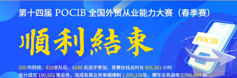 本次大赛新增FAS、DAP、DPU三种贸易术语和RCEP原产地证书的相关内容,从POCIB国际贸易从业技能综合实训和数字贸易B2B两大模块进行综合考核。POCIB国际贸易从业技能综合实训模块中,要求每位参赛选手作为独立的进出口企业开展国际贸易,主要考察英文函电磋商、贸易术语与结算方式的运用、商品价格核算、成本控制、扩大利润的方法以及进出口贸易单据的制作等方面内容。数字贸易B2B模块中,要求每位选手在数字贸易B2B电商平台中进行店铺入驻、商品发布、交易磋商、起草订单、订单履约和营销活动等跨境电商外贸环节中的各项业务流程操作。公司学子自3月报名以来,在指导老师的带领下积极备赛、开展研讨,最终突破历史成绩、实现全员大满贯。根据 “所在参赛团队获得团体奖项且个人POCIB模块成绩85分(含)以上”的相关规定,所有参赛员工均可获得由“中国国际贸易学会”出具的“POCIB国际贸易从业技能综合实训成绩合格证明”。